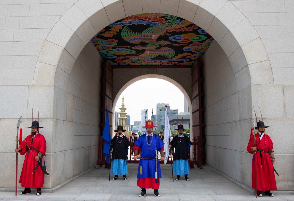 Royal guard stand in formation after completing the changing of the guard ceremony at Gyeongbokgung Palace in Seoul. Photo taken by Skylar Rispens.Royal guard march from the entrance to Gyeongbokgung Palace in Seoul. Photo taken by Skylar Rispens.